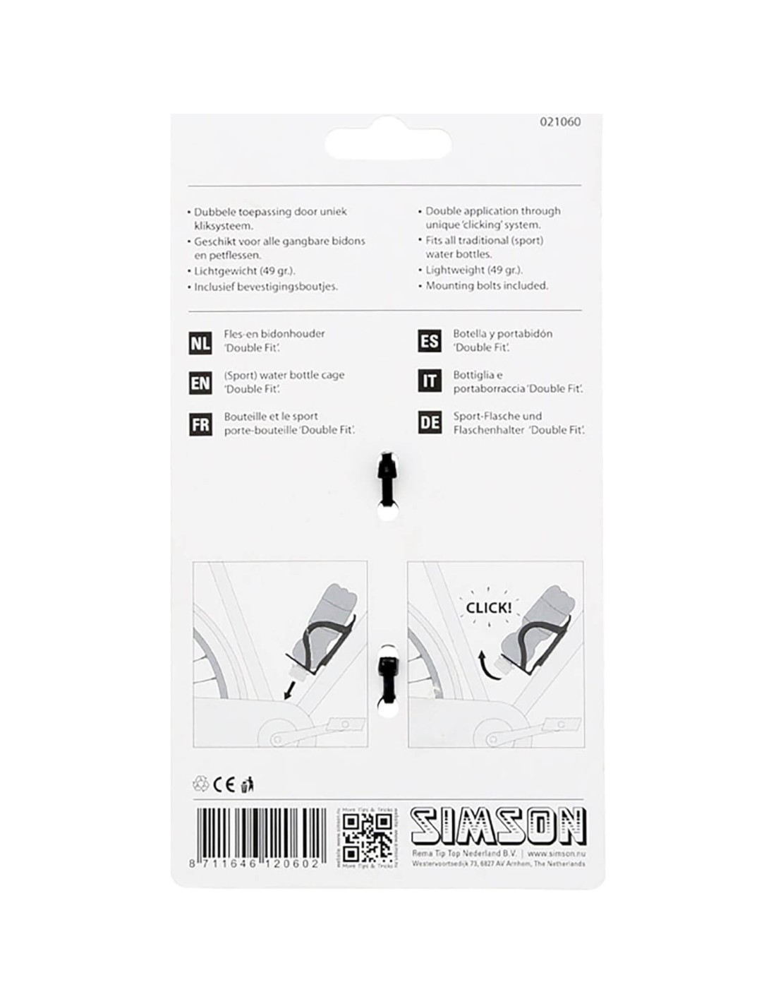 De Simson Double Fit fles- en bidonhouder houdt alle traditionele bidons moeiteloos vast tijdens de fietsrit en de gepatenteerde fleshalsopening maakt de Double Fit ook geschikt voor het veilig en slim vervoeren van PET flessen. Klik met het unieke kliksysteem de fles gemakkelijk los uit de houder om snel wat te drinken tijdens het fietsen. De Double Fit is licht van gewicht (49gr) en zeer geschikt voor de sportieve fietser. Monteer de Double Fit met behulp van een inbussleutel en de meegeleverde inbusboutjes op de fiets.