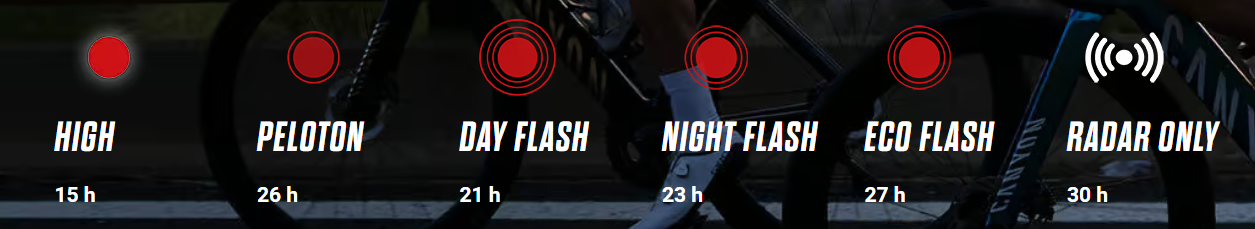 RECO 81 LINK heeft zes lichtmodi voor elke rijsituatie. In High Mode zorgt het achterlicht voor sterke continue verlichting, terwijl Radar Only Mode het licht alleen activeert wanneer een voertuig nadert, met een looptijd tot 30 uur. Daarnaast zijn Day Flash, Night Flash, Eco Flash en de innovatieve Peloton Mode beschikbaar. Dit is speciaal ontwikkeld voor groepsritten: het vermindert de lichtintensiteit om passagiers niet te verblinden, terwijl de radarfunctie actief blijft, voor veiligheid binnen het team en maximale overweging.