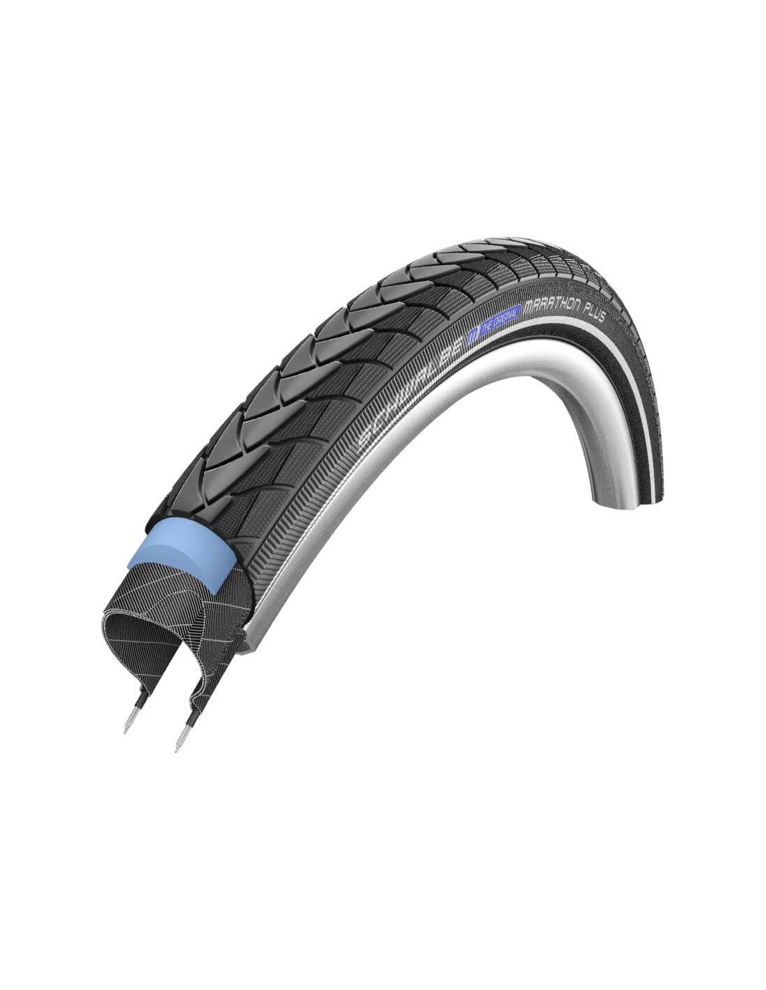 Schwalbe buitenband 700x28/28x1.10/ 28-622 MARATHON PLUS, SmartGuard reflectie zwart,11100767.01V. Het meest verkochte model van Schwalbe. De meest lekbestendige luchtband die er is. Naast de geweldige lekbescherming overtuigt hij door veel inwendige waarden. De gepatendeerde 5 mm dikke SmartGuard laag heeft tegenover alle imitatie producten een duidelijk voordeel betreffende de rolweerstand. Ook bij SmartGuard gebruiken we nu een aandeel aan gerecycled rubber uit oude latexproducten. Verdraagt de typische overbelasting door een te lage bandenspanning beduidend langer voordat er scheurtjes ontstaan. De belangrijkste afmetingen zijn voor E-bikes tot 25 km per uur getest en geschikt.