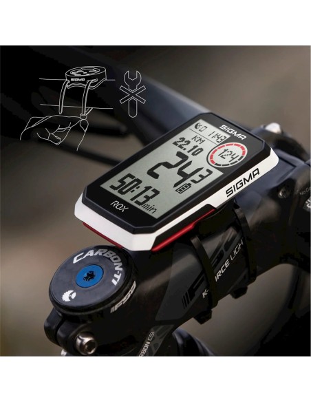 ROX 4.0 GPS White (standaard stuurhouder + USB-C oplaadkabel) : met hoogtemeting De ROX 4.0 GPS fietscomputer ondersteunt fietsers met haar 30 functies en haar bedieningsgemak tijdens de fietstocht, zodat de fietsers zich op de wezenlijke zaken kunnen concentreren: het plezier tijdens het fietsen. Het extra grote display geeft gegevens zoals hoogteprofiel, snelheid, afstand en trainingstijd betrouwbaar weer. Track-navigatie en turn-by-turn aanwijzingen (via de Sigma Ride app en/of de komoot app), de koppeling met de E-bike en verbinding met externe sensoren (* snelheid, cadans en hartslag) zijn geen probleem voor de ROX 4.0 fietscomputer. Dankzij de gratis SIGMA RIDE app kunnen actuele ritgegevens op elk moment op uw smartphone worden gevolgd en geanalyseerd. De contrastrijke display van de ROX 4.0 is vanwege haar afmetingen en de extra grote cijfers ook tijdens de rit zeer goed afleesbaar. Een speciale Red Circle rechtsboven in het display heeft een gekleurde achtergrond en biedt fietsers een innovatieve en hoogwaardige weergave van hun trainingsgegevens. In combinatie met de gratis SIGMA RIDE app voor de smartphone kunnen individuele displayweergaven met slechts enkele kliks worden ingesteld - er kunnen tot wel zes schermen met steeds drie waarden worden geconfigureerd. De actuele snelheid wordt als vierde waarde permanent op het display weergegeven. De ROX 4.0 fietscomputer wordt in een handomdraai op het stuur gemonteerd. De montage van kabels of sensoren is niet nodig. Na het inschakelen bepaalt de ROX 4.0 binnen enkele seconden middels GPS en GLONASS de positie van de fietser. In combinatie met de intuïtieve bediening met behulp van drie knoppen kan de fietstocht direct worden gestart. Barometrische hoogtemeting: Een echt hoogtepunt bij de ROX 4.0 is de geïntegreerde luchtdruksensor. Met behulp van deze barometrische meting levert deze de fietsers betrouwbaar informatie over de hoogte, bepaalt stijgingen en dalingen en maakt zo een nauwkeurige registratie van de route mogelijk. Ook kan een grafisch hoogteprofiel op de ROX 4.0 worden opgeroepen. De starthoogte aan het begin van de route kan automatisch middels GPS worden gekalibreerd of kan indien gewenst handmatig worden ingesteld. SEARCH & GO - het slimme 1-punts navigatiesysteem: Met de nieuwe Search & Go Navigatie kun je snel elke bestemming vinden, ingeven en ernaartoe navigeren. Voer een adres in in de SIGMA RIDE app of klik op een punt op de kaart. De route wordt berekend aan de hand van je ingestelde route-voorkeuren zoals straten, fietspaden, onverharde paden of wandelpaden). Aansluitend kan de route direct op de ROX 4.0 worden gestart of voor later in de SIGMA RIDE app worden opgeslagen. Als je de route opgeslagen hebt, kun je deze ook als GPX-bestand exporteren of delen met je vrienden. Creëer zelf tracks of importeer tracks uit externe portals: De ROX 4.0 kan eenvoudig worden gekoppeld met de SIGMA RIDE app. Je kunt de Ride app ook gebruiken om routes te synchroniseren uit het SIGMA DATA CENTER, onze software waar je zelf routes kunt maken of importeren van externe portals zoals komoot of Strava. Naast de track-weergave krijg je ook de turn-by-turn aanwijzingen in beeld op je ROX fietscomputer. De geselecteerde track kan ook worden opgeslagen op de fietscomputer en kun je 'offline' fietsen zonder dat je perse met je smartphone verbonden moet zijn. Ook kun je de turn-by-turn middels een pijl in de Red Circle tonen waarbij deze de afstand aftelt tot de volgende afslag af door middel van gekleurde balkjes. Bovendien wordt het aantal meters tot de volgende afslag getoond. E-bike ready: De ROX 4.0 is E-bike ready en kan zeer eenvoudig met vele E-bikes worden gekoppeld. De GPS fietscomputer maakt verbinding met het compatibele E-bike-systeem en toont de actuele stand van de trapondersteuning, accustatus, licht en overige gegevens op het display of in de Red Circle. Handige data-evaluatie: Met de SIGMA RIDE app worden trainingsgegevens via BLE naar de smartphone overgedragen en verzameld. De belangrijkste data en statistieken kunnen met de gekleurde datavelden overzichtelijk worden weergegeven, en altijd op het scherm worden afgelezen en gemakkelijk worden geëvalueerd.