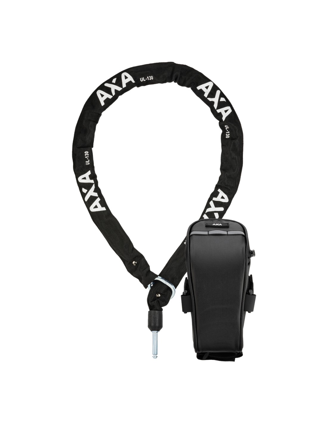 Axa insteek ketting ULC 130 zwart, Block XXL ketting, Universele Plug in pin diameter 10 mm, Diefstalvertragend. Lengte 130 cm, Voor extra bereik, Sterke polyester hoes, past op meerdere merken. Dit is de uitvoering met praktische zadeltas.