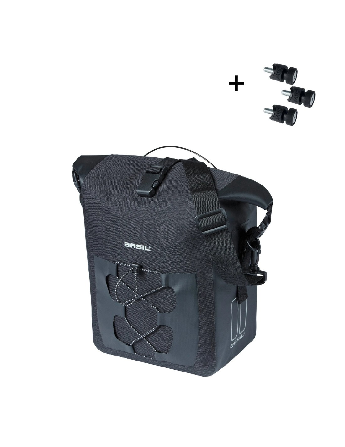 Basil Navigator Waterproof M enkele fietstas, waterdicht (IPX3), tarpaulin/600D polyester, roltopsluiting met extra instelbare sluiting, compressie voorvak dmv instelbare reflecterend elastiek, handvat, afn. schouderriem, MIK Studs systeem, reflectie,14L,zwart. Als de drager niet is voorbereid voor MIK Stud dan kan de adaper MS70204 gebruikt worden.