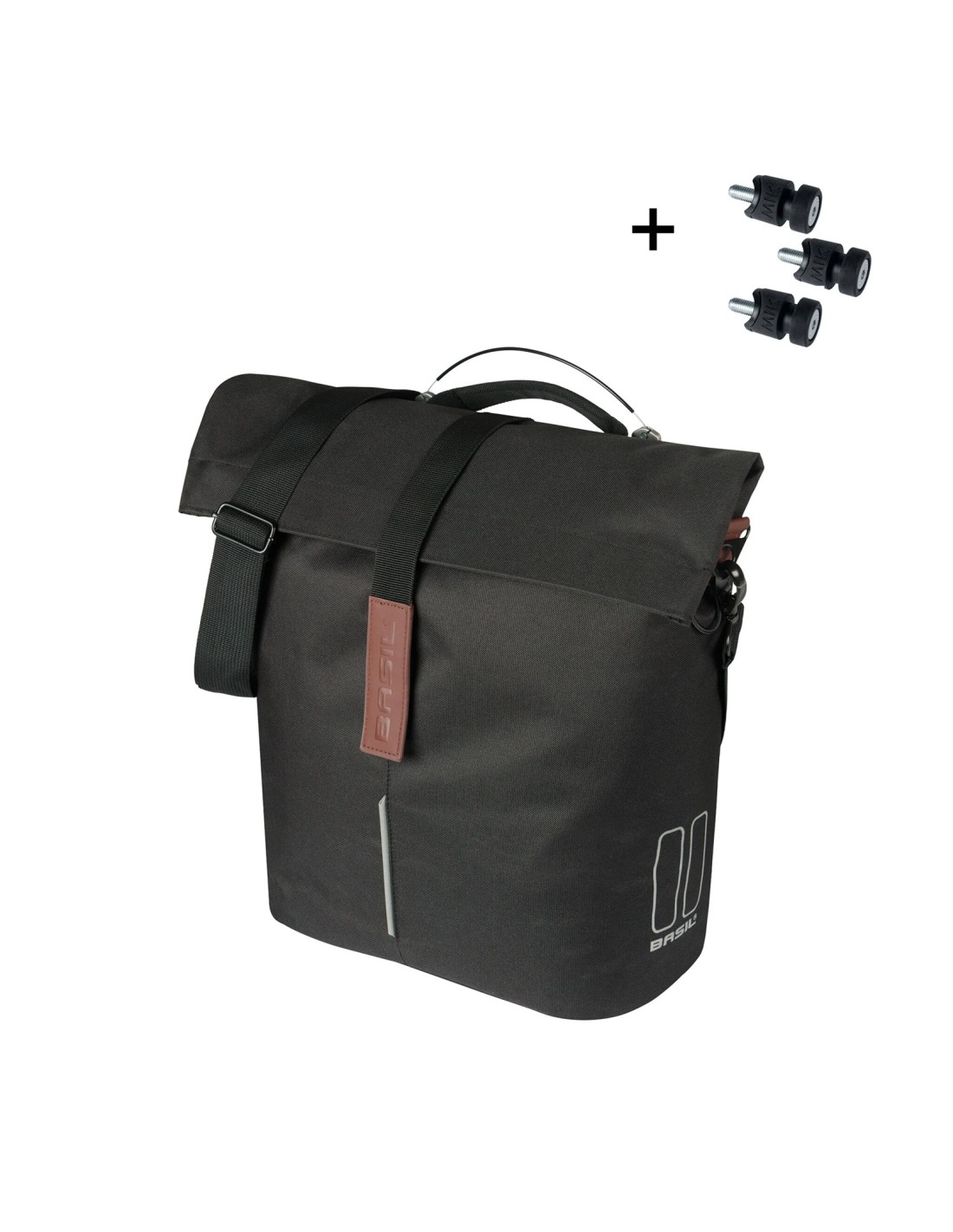 Basil City Shopper MIK Studs, shoppertas, polyester, waterkerende vouwsluiting met klittenband , incl. afneembare schouderband en handgreep binnenvak met rits, bevestigingsmogelijkheid LED, MIK Studs systeem, reflectie op alle zijden, 14-16L, black. Als de drager niet is voorbereid voor MIK Stud dan kan de adaper MS70204 gebruikt worden.