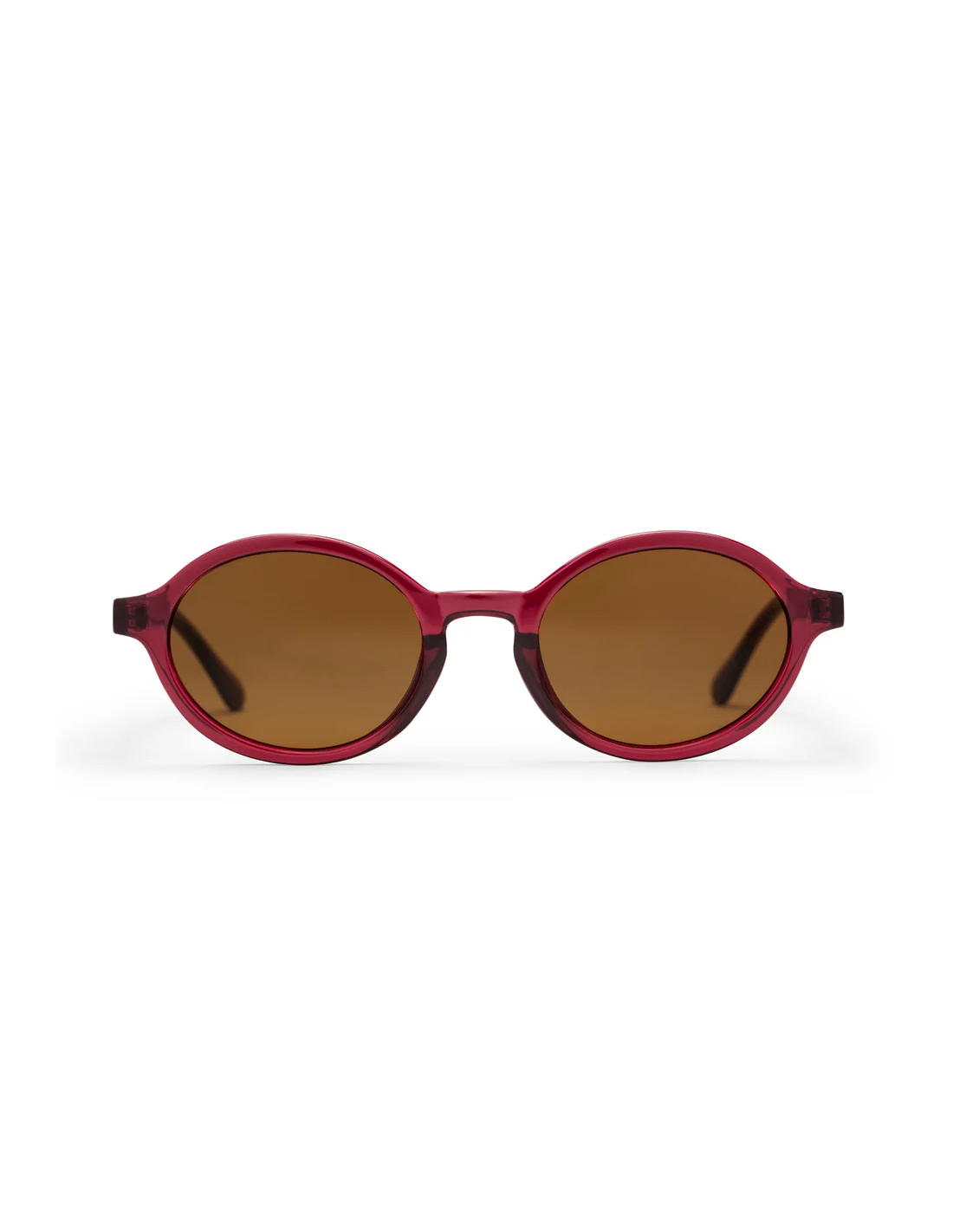 Een bordeauxrood montuur gemaakt van 100% gerecycled plastic met een bruine lens.