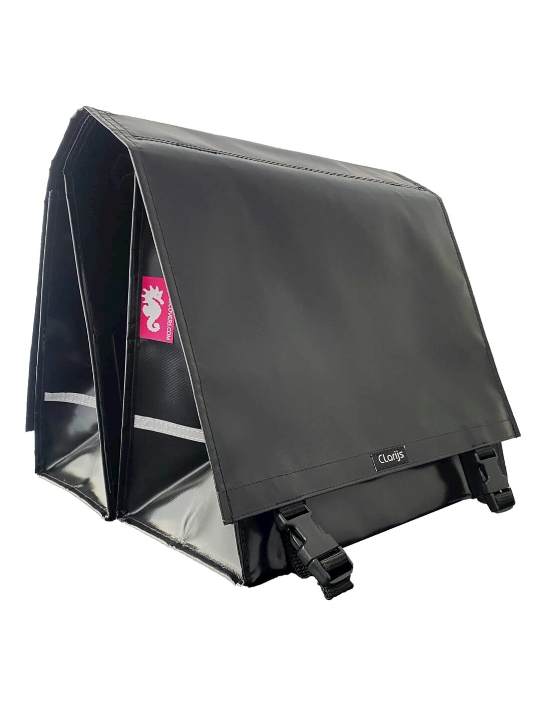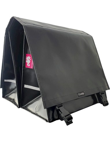 De dubbele fietstas zwart met midden uitsparing (16x16cm) met midden uitsparing (16x16cm) van Clarijs is ideaal voor op een elektrische fiets en de gewone fiets. Deze dubbele fietstas is gemaakt van PVC-doek en daardoor heel waterdicht. Ook heeft de fietstas reflectie aan de voor- en achterkant. Op die manier is de tas beter zichtbaar in donkere of mistige weersomstandigheden. Voordelen van deze tas: Altijd droge spullen! Geschikt voor zware weersomstandigheden, geschikt voor bijna elke fiets. (Ook elektrische fietsen), Clarijs biedt alleen de hoogste kwaliteit materialen, reflectie aan de voorkant & de achterkant en het deksel is voorzien van regenflapjes tegen inregenen. De gespen zijn bevestigd met een flexibele waterafstotende PP band aan de tas. De vierkante uitsparing kan handig zijn voor als u de snelbinders vrij wilt hebben of een mandje of kinderzitje op de bagagedrager wilt bevestigen.