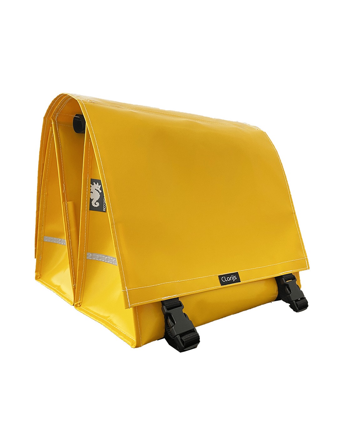 De dubbele fietstas geel met midden uitsparing (16x16cm) van Clarijs is ideaal voor op een elektrische fiets en de gewone fiets. Deze dubbele fietstas is gemaakt van PVC-doek en daardoor heel waterdicht. Ook heeft de fietstas reflectie aan de voor- en achterkant. Op die manier is de tas beter zichtbaar in donkere of mistige weersomstandigheden. Voordelen van deze tas: heel veel ruimte in een dubbele fietstas van Clarijs. (46 Liter!). Altijd droge spullen! Geschikt voor zware weersomstandigheden, geschikt voor bijna elke fiets. (Ook elektrische fietsen), Clarijs biedt alleen de hoogste kwaliteit materialen, reflectie aan de voorkant & de achterkant en het deksel is voorzien van regenflapjes tegen inregenen. De gespen zijn bevestigd met een flexibele waterafstotende PP band aan de tas. Uitstekend te combineren met de Clarijs shoppers. De Clarijs Shoppers zijn op maat gemaakt en passen precies in de dubbele fietstassen. De shopper kan dus met gemak in een dubbele fietstas worden geplaatst. Het XL-formaat heeft een extra middenriem om het midden om de tas omhoog te trekken en extra stevigheid te creëren bij zware belading. De vierkante uitsparing kan handig zijn voor als u de snelbinders vrij wilt hebben of een mandje of kinderzitje op de bagagedrager wilt bevestigen.