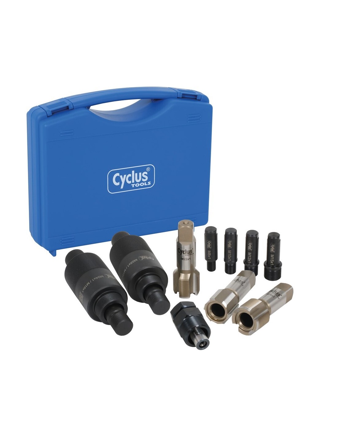 Met deze afnemer- en reparatieset kunnen cranks met een binnendraad van M22x1 en M24x1 probleemloos verwijderd worden. Geschikt voor zowel conventionele trapassen met conische verbinding als moderne E-bike toepassingen met een langere slag. Dankzij de langere as is de cranktrekker ook geschikt voor cranks met een hogere Q-maat. Zelfs bij beschadigde pedaaldraden biedt deze set een oplossing, waardoor vervanging van de crank vaak niet nodig is – een investering die zichzelf terugverdient.