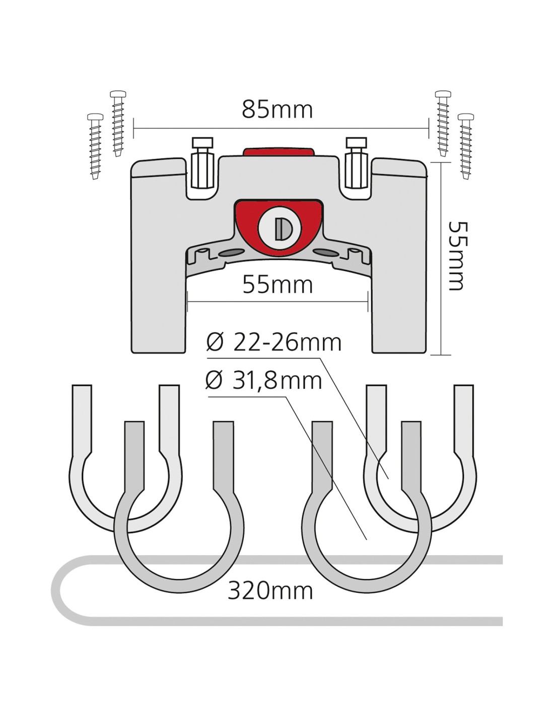 Stuuradapter Universeel met Slot. Zwart-rood voor sturen met een diameter van 22–26 mm en 31,8 mm. Wilt u uw mandje of shopper veilig op uw fiets laten zitten? Dan is de Stuuradapter met slot de juiste keuze. De rode knop integreert een hoogwaardig metalen slot. Alle accessoires kunt u na het winkelen op uw fiets klikken en eenvoudig losmaken met een druk op de rode knop. Deze adapterversie is afsluitbaar en bevat 2 standaard klemmen voor sturen met een diameter van 22–26 mm en 2 oversized klemmen voor sturen met een diameter van 31,8 mm. Zelfs bij zware belasting zakt de adapter niet naar beneden dankzij de gepatenteerde veiligheidskabel.