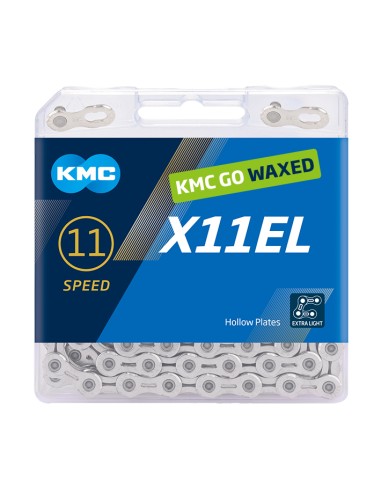 KMC ketting X11EL silver 118 schakels (extra light).Dankzij de innovatieve formule van KMC GO CHAIN WAX bieden de premium KMC kettingen die met onze wax zijn behandeld, naast een hoge efficiëntie ook een ongeëvenaarde duurzaamheid. Vergeleken met smeermiddelen op oliebasis zijn gewaxte kettingen minder gevoelig voor vuilopbouw, waardoor de levensduur van de aandrijflijn toeneemt en de reinigingsintervallen korter worden.