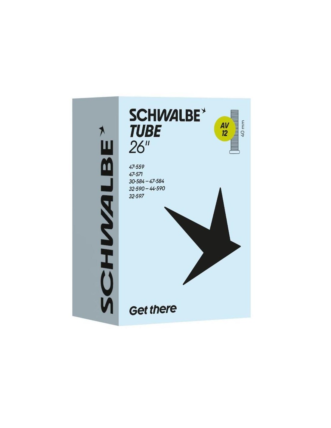 Schwalbe binnenband AV12, geschikt voor 26 inch, in de ETRTO maat 30/47-559/597. Voorzien van een 40mm lang Auto/Schrader ventiel. Schwalbe binnenbanden zijn 100% volledig recyclebaar.
