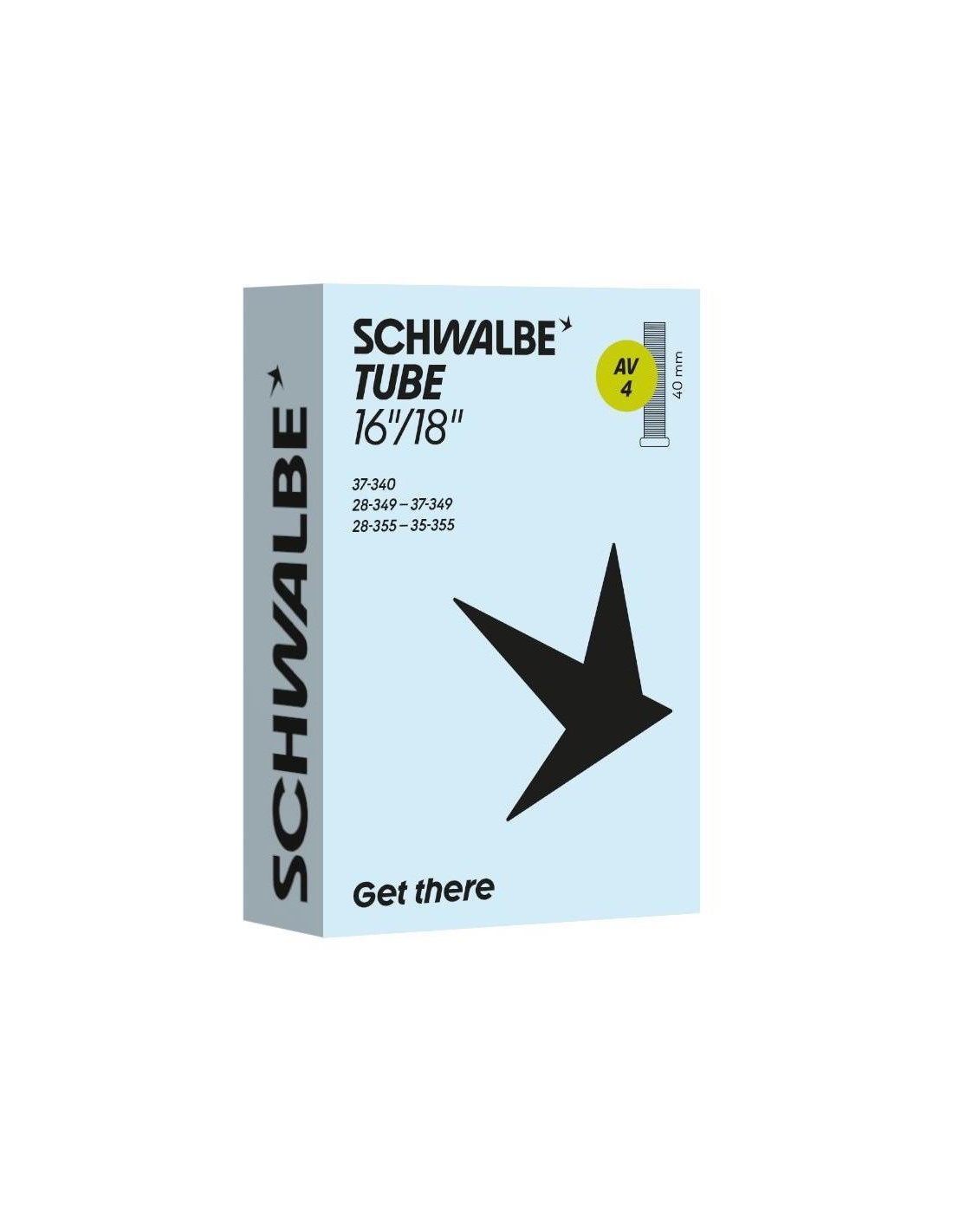 Schwalbe binnenband AV4, geschikt voor 16-18 inch, in de ETRTO maat 28/37-340/355. Voorzien van een 40 mm lang Auto/Schrader ventiel. Schwalbe binnenbanden zijn 100% volledig recyclebaar.