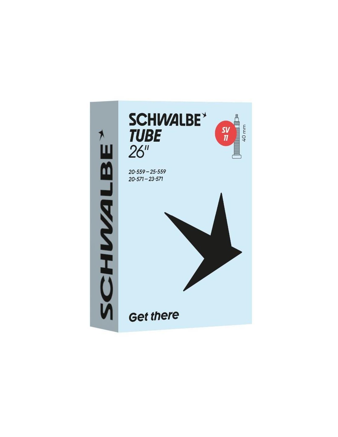 Schwalbe binnenband SV11, geschikt voor 26 inch, in de ETRTO maat 20/25-559/571. Voorzien van een 40mm lang Frans/Sclaverand ventiel. Schwalbe binnenbanden zijn 100% volledig recyclebaar.