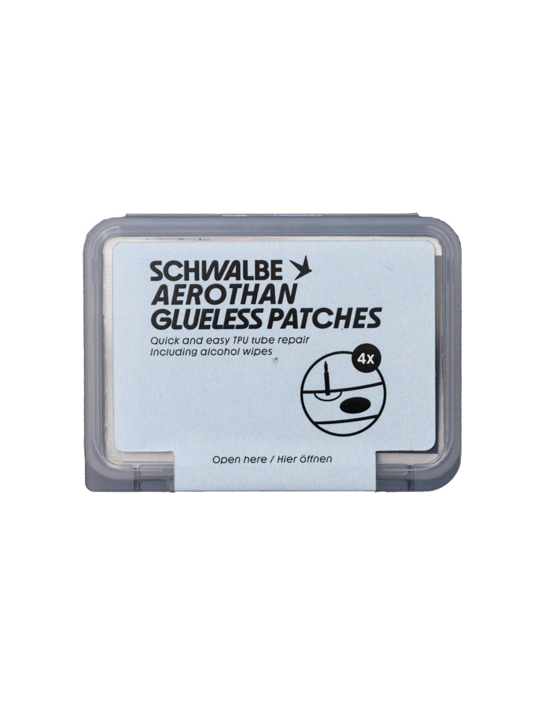 Schwalbe plakkers Glueless Patches Aerothan reparatieset. Met de zelfklevende pleisters van Schwalbe repareer je snel en eenvoudig een gat in je Aerothan binnenband. De patches zijn speciaal ontwikkeld voor het repareren van Schwalbe TPU binnenbanden. Let Op: Niet voor butyl binnenbanden!