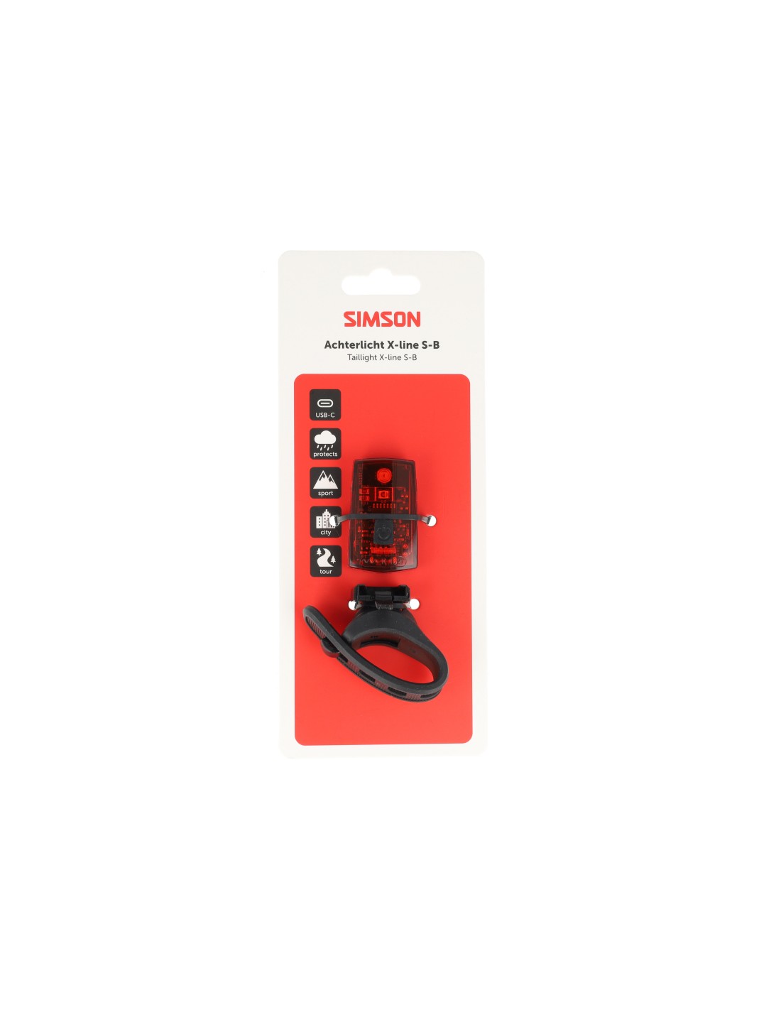 Simson achterlicht Aurora X-line S. Modern gemak op de zadelpen. Geen batterijen nodig: laad dit achterlicht eenvoudig op via USB-C. Inclusief remlichtfunctie voor extra veiligheid op uw sportieve fiets of E-bike.