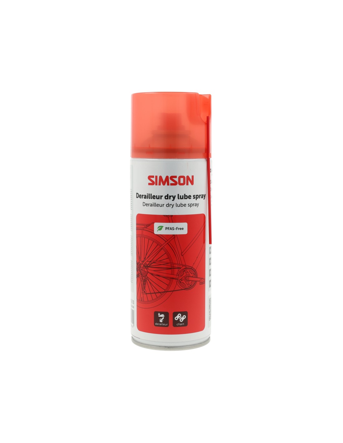 De Simson Derailleur Dry Lubespray 400ml is een hoogwaardig smeermiddel voor derailleurmechanismen en derailleurkettingen. Zorgt voor een langdurige smering die blijft werken onder zware belasting. Vermindert slijtage doordat de spray de wrijving tussen onderdelen sterk reduceert. Simson Derailleur Dry Lube spray vormt een dunne smeerlaag, heeft een fijne structuur en een uitstekende hechting. De Simson Derailleur Dry Lube Spray wordt geleverd in een 400ml spuitbus met een extra rietje om de spray eenvoudig op de gewenste plaats aan te brengen. De Simson Derailleur Dry Lube spray is PFAS vrij.
