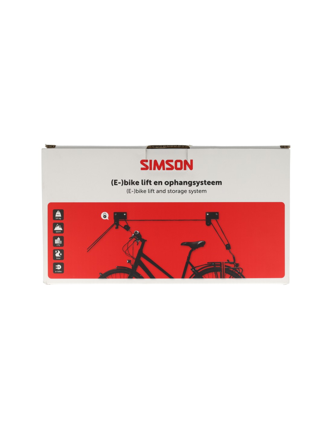 Met de extra sterke Simson (E)-bike lift en ophangsysteem kan je eenvoudig thuis een fietsreparatie uitvoeren of een (E)-bike opbergen. De fiets kan op verschillende hoogtes worden gehangen door middel van katrollen. De TÜV gekeurde Simson (E)-bike lift en ophangsysteem kan maximaal 54 kilo dragen en op 3 meter hoog worden gehangen. Let hierbij op dat het plafond waar de lift aan gemonteerd wordt dit ook kan dragen. Bij de Simson (E)-bike lift en ophangsysteem worden ook handige draagbanden meegeleverd. Hiermee kan bijvoorbeeld een dakkoffer of surfplank snel en makkelijk worden opgeborgen.