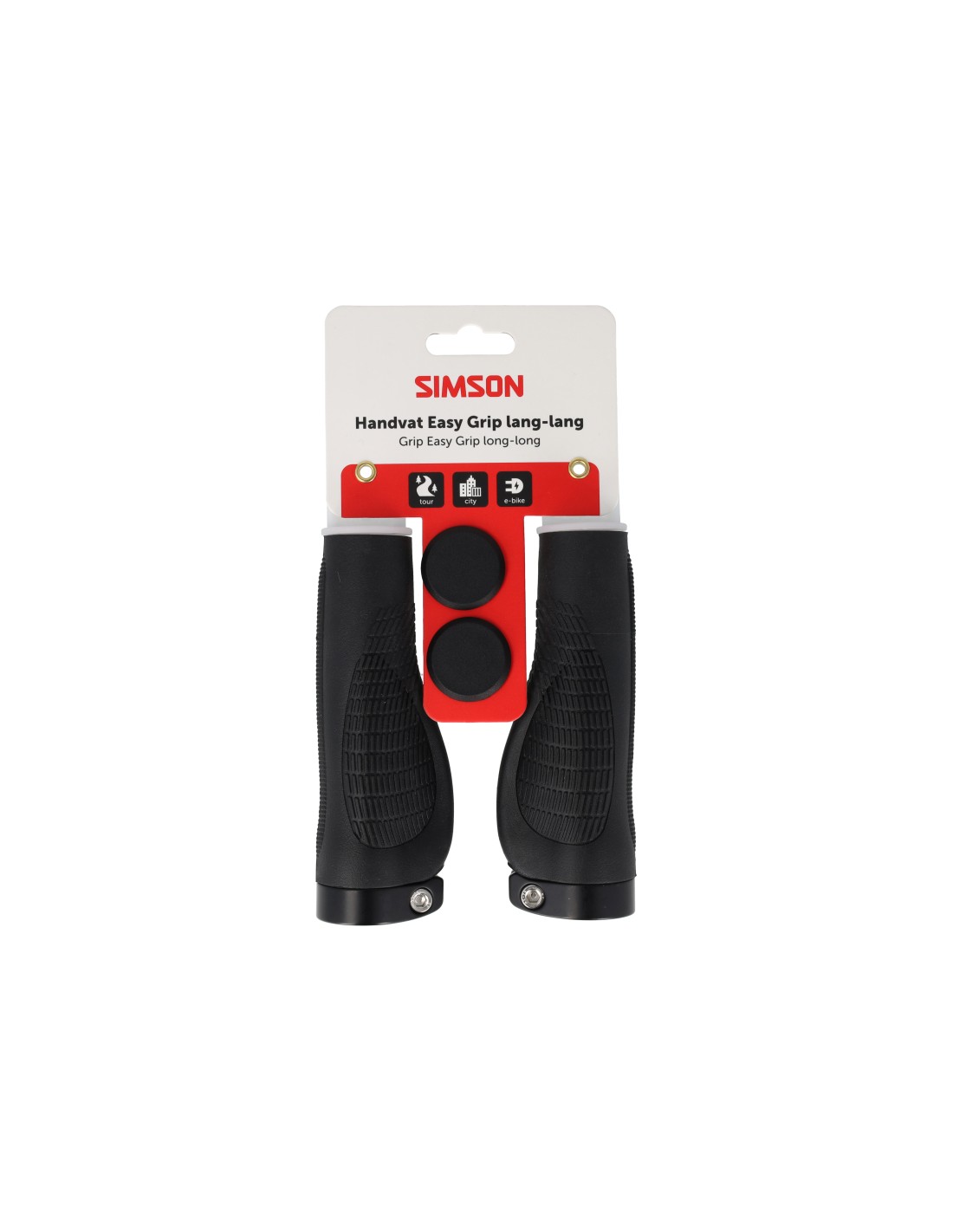 Ga voor comfort en veiligheid met de Simson Handvatten Easy Grip. De speciaal ontworpen handvatten biedt u goede grip en comfort tijdens uw fietstocht. Met de aluminium buitenklem worden de handvatten stevig en eenvoudig aan het stuur bevestigd. De handvatten zijn gemaakt van hoogwaardig en stevig materiaal. De handpalmresten zorgen voor comfort en een goede grip. De Simson handvatten zijn te verkrijgen in de variant van twee lange handvatten van 130mm of in de variant van één lang handvat van 130mm en een korte handvat van 95mm.