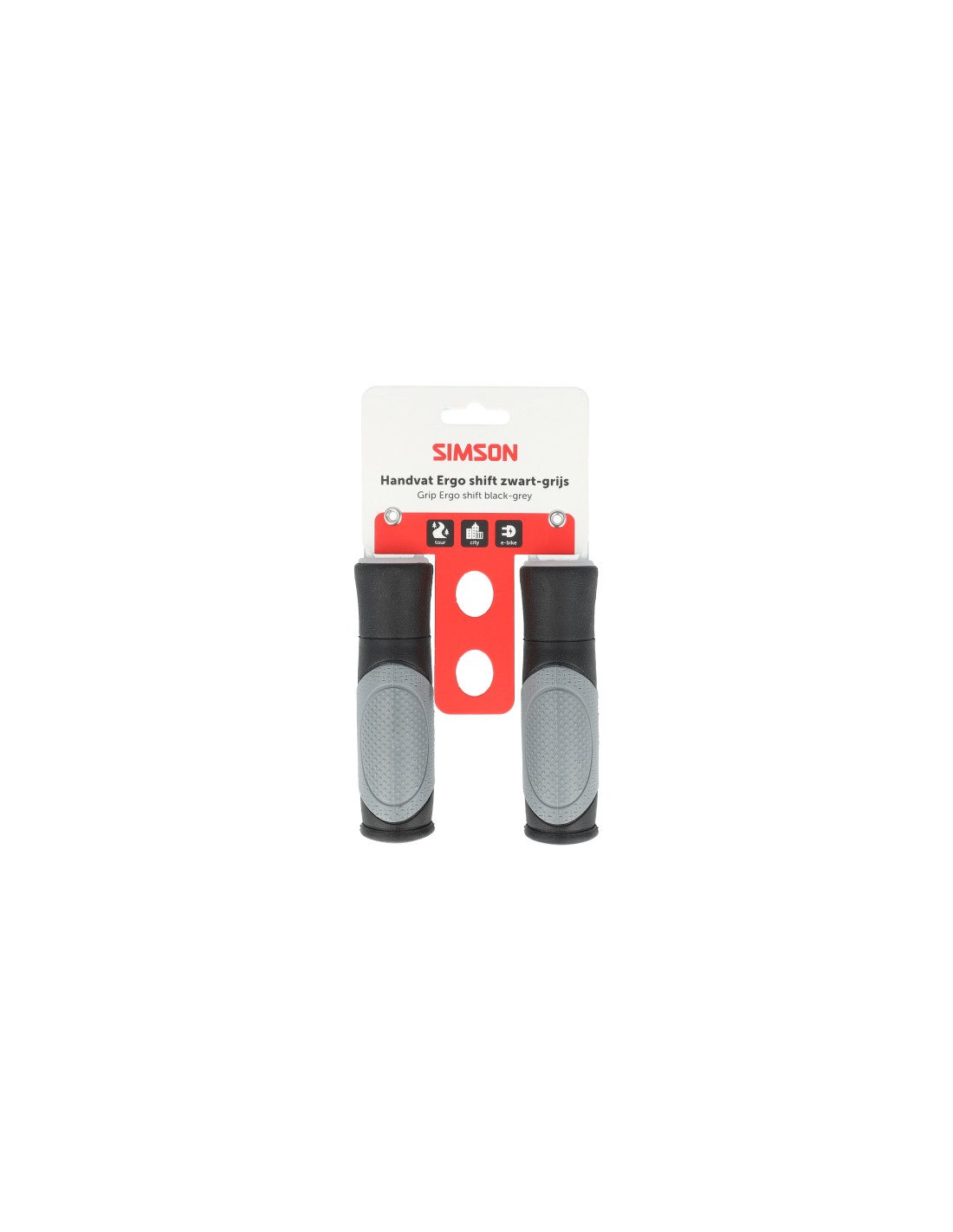 Simson Handvatten Ergo shift met palmondersteuning uitgevoerd in trendy Zwart-licht grijs duocolor. De handvatten hebben een ultrazachte uitvoering voor optimaal comfort van de handen. De handvatten zijn geschikt voor vrijwel alle fietsen met of zonder een gripshift versnelling. Voor fietsen met een gripshift versnellingen kunnen de handvatten ingekort worden naar 92 mm door deze op maat af te snijden op de snijlijn. Verwijder het oude handvat en schuif het Simson handvat op de gewenste plek.