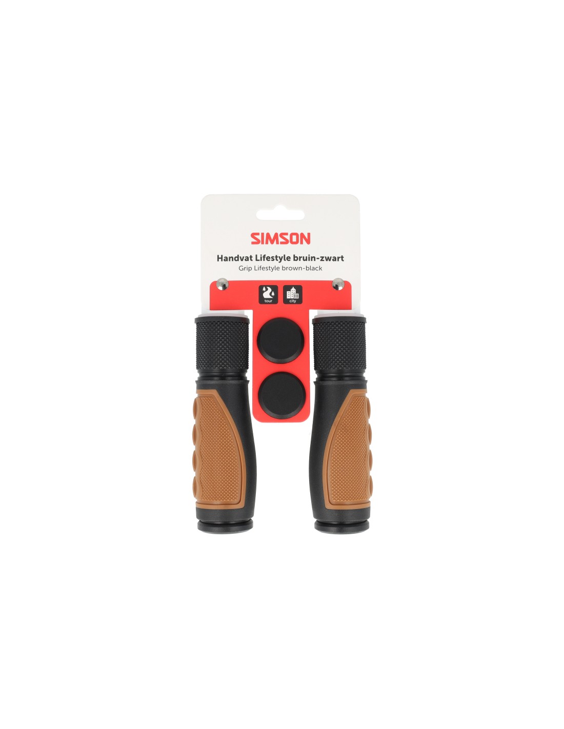 De Simson handvatten Lifestylee middenbruin-zwart zijn traditionele handvatten met extra grip, uitgevoerd in trendy duocolor. Aan de binnenkant zijn de handvatten gevoerd met een zachte vulling voor optimaal comfort van de handen. De handvatten zijn geschikt voor vrijwel alle fietsen met of zonder een gripshift versnelling. Voor fietsen met een gripshift versnellingen kunnen de handvatten ingekort worden naar 92 mm door deze op maat af te snijden op de snijlijn. Verwijder het oude handvat en schuif het Simson handvat op de gewenste plek.