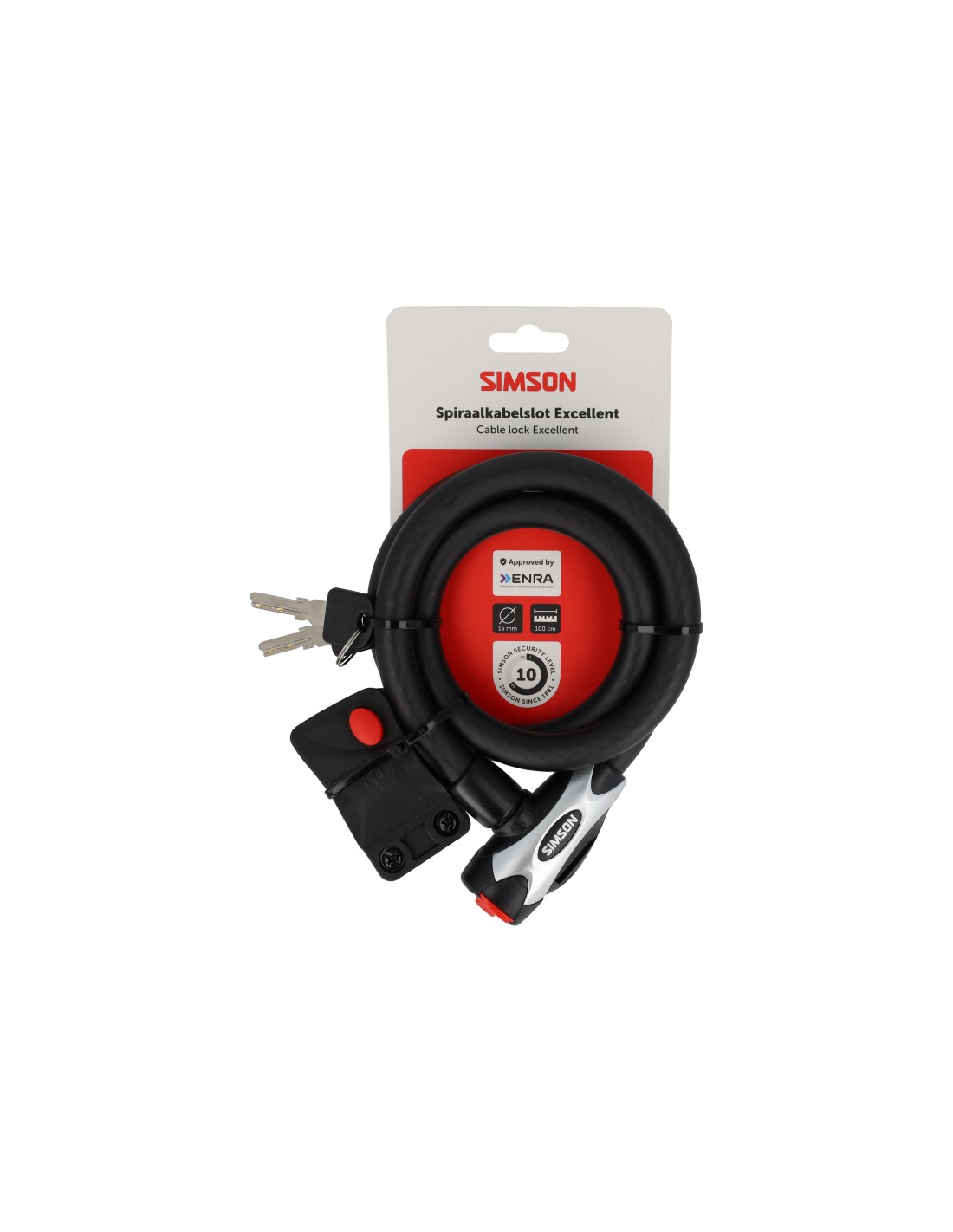 Het Simson Kabelslot Execellent size L is een robuust mat zwart kabelslot met een lengte van 1 meter. Met dit extra dikke 15mm slot staat de fiets altijd veilig. Het slot is makkelijk en compact mee te nemen en wordt geleverd inclusief bevestiging voor aan de fiets, en twee sleutels.