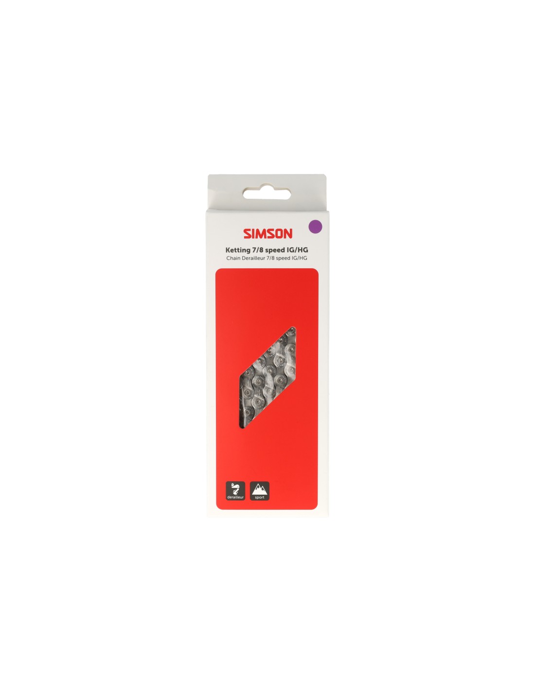 De Simson Ketting Derailleur 7/8 is een kwalitatief hoogwaardige fietsketting geschikt voor fietsen met 7 of 8 (IG/HG) derailleurversnellingen. Deze ketting heeft 116 schakels en een maat van 1/2x 3/32. De ketting is op maat te maken met behulp van een Simson kettingpons. Leg de ketting over de tandwielen en sluit de uiteinden van de ketting aan elkaar door de bijgeleverde verbindingsschakel vast te klikken.