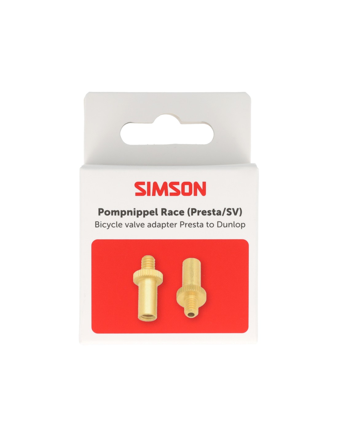 Met de Simson Pompnippel Frans kan een band met een Frans ventiel opgepompt worden met een gewone fietspomp. De Simson Pompnippel is gemaakt van messing voor een optimale levensduur. Draai het Frans ventiel open, draai de Simson pompnippel op het Frans ventiel waarna de band opgepompt kan worden met een gewone fietspomp.