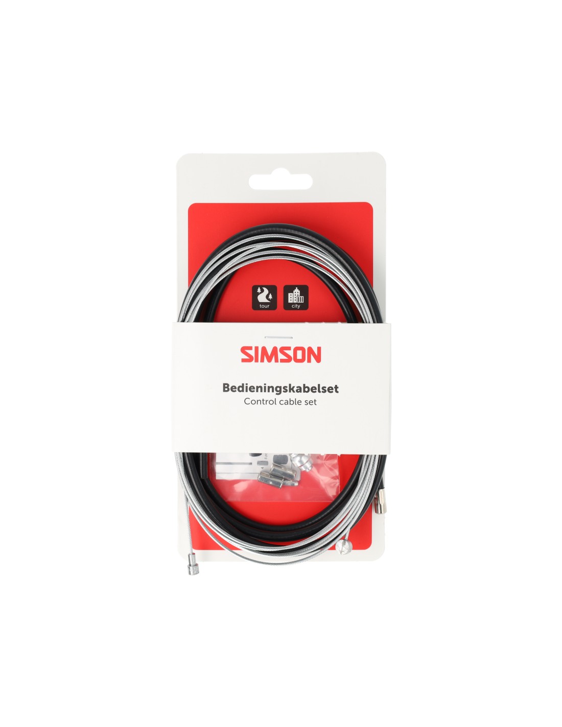 De Simson Remkabelset universeel zwart is een complete remkabelset. De set bestaat uit een zwarte buitenkabel en een gegalvaniseerde binnenkabel van 1.70 meter met een universele ton- en peernippel. De set wordt geleverd inclusief inbussleutel en bevestigingsmateriaal. Knip de nippel die niet van toepassing is af. Steek de binnenkabel door de buitenkabel en sluit de binnenkabel aan op de rem. Stel de rem af en knip de binnenkabel A± 2 cm voorbij schroefnippel af. Omdat de remkabelset universeel is, kunnen er onderdelen overblijven.