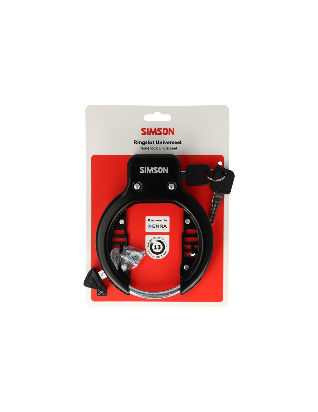 Het Simson Ringslot Normaal is universeel toepasbaar op bijna ieder frame. Het slot wordt geleverd met twee sleutels en heeft een brede opening van 5,7 cm waardoor het slot ook geschikt is voor montage over brede spatborden.
