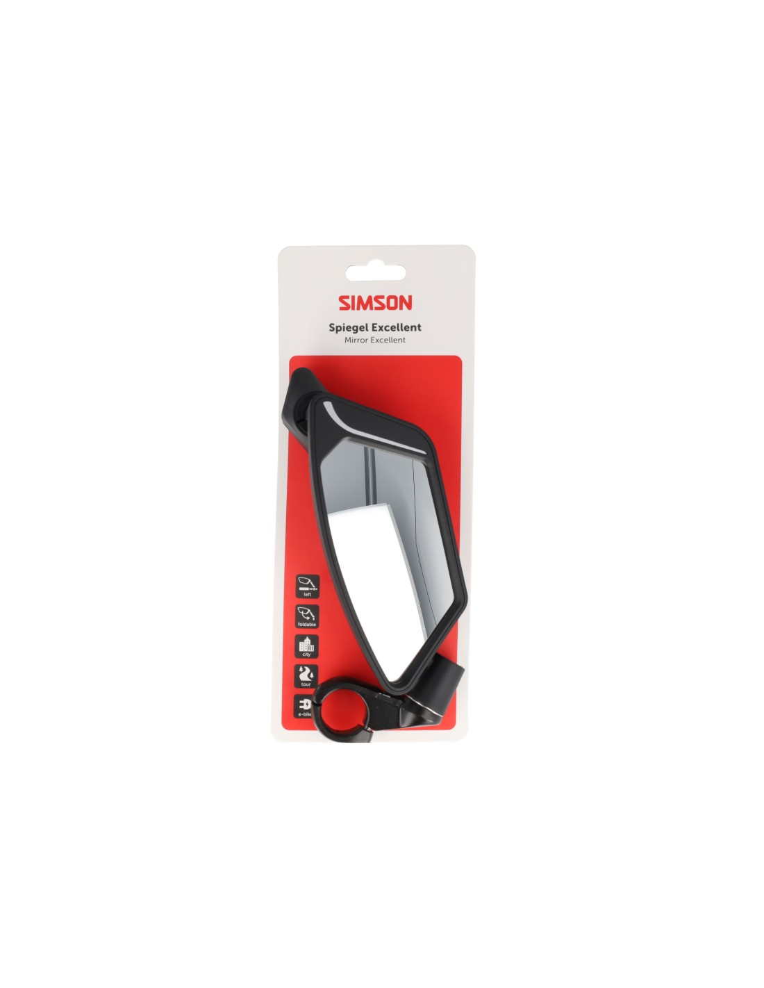 De Simson Spiegel Excellent is een zeer sterke spiegel voor de veeleisende e-bike gebruiker, maar misstaat door de moderne uitstraling op geen enkele fiets. De lens van de Simson Spiegel Excellent is gemaakt van zeer sterk veiligheidsglas. De arm is gemaakt van vezel versterkt nylon en de stuurklem is gemaakt van aluminium. Hierdoor is de Simson Spiegel Excellent zeer ligt van gewicht en tegelijk erg sterk en duurzaam. De spiegel is in lengte en hoek verstelbaar en kan worden ingeklapt als de fiets in een fietsenstalling wordt geplaatst. De Simson Spiegel Excellent is geschikt voor stuurdiameters tot 22,2 cm.