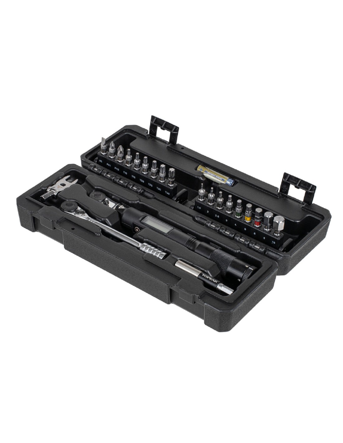 Topeak momentsleutel Torq Stick Pro Digitaal. Een onmisbare gereedschapsset voor dagelijks onderhoud. Bevat een gloednieuwe Heavy Duty Ratchet Tool, een complete set gereedschapsbits en een nieuwe digitale momentsleutel om te voldoen aan uw behoefte aan nauwkeurig koppel. TT2631
