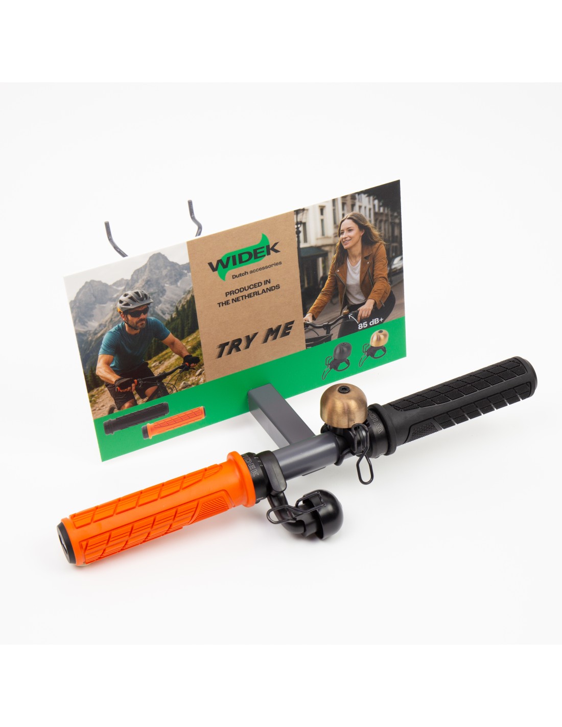 Widek Wandpresentatiebeugel Combi Handvat / Fietsbel + Widek bordje, Perfo / Slatwall. Inclusief handvatten en bellen