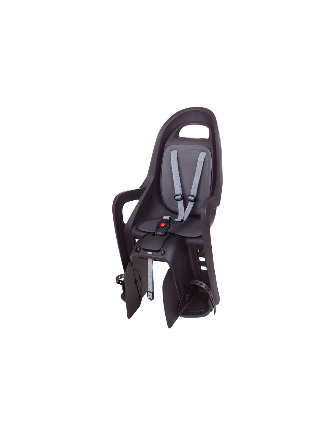 De Polisport Groovy met bagagedragerbevestiging biedt een veilige en gebruiksvriendelijke oplossing voor ouders die hun kind comfortabel mee willen nemen op de fiets. Dit model is ontworpen voor bagagedragers met een breedte van 120–175 mm en ronde framebuizen van Ø10–16 mm, en vereist een minimale draagcapaciteit van 27 kg volgens ISO 11243:2016. Het draagsysteem is volledig gereedschaploos: dankzij het eenvoudige draaimechanisme plaats je het zitje binnen enkele seconden stevig op de bagagedrager – ideaal voor dagelijks gebruik, woon-werkverkeer of wanneer je het zitje na de rit snel wilt opbergen.De vernieuwde Groovy® heeft een fris, modern design met glanzende details en een geïntegreerde reflector aan de achterzijde voor extra zichtbaarheid. Het geïntegreerde draagsysteem zorgt voor een stabiele en veilige bevestiging, terwijl het zitje eenvoudig naar voren of achteren kan worden verschoven om beter aan te sluiten op de lichaamslengte van het kind of de geometrie van de fiets.Op het gebied van veiligheid voldoet de Polisport Groovy volledig aan de EN 14344:2022-norm en draagt het de GS Mark. Het zitje is uitgerust met een verstelbaar 3-punts veiligheidsharnas, een kindveilige sluiting, een extra veiligheidsframe-riem en uitgebreide voetbescherming.Ook het comfort van het kind staat centraal. De armsteunen hebben een ergonomische vorm, het ontwerp is helmvriendelijk, en de voetsteunen zijn verstelbaar in vier standen. Het zachte, waterdichte kussen zorgt voor een aangename rit, terwijl het harnassysteem eenvoudig kan worden aangepast aan de groei van het kind.Het zitje is geschikt voor kinderen van ongeveer 9 maanden tot 6 jaar, met een maximaal gewicht van 22 kg en een maximale lengte van 110 cm. Voor een goede pasvorm zijn gewicht en lengte leidend. De Groovy is daarnaast compatibel met e-bikes en pedelecs tot 25 km/u.Met afmetingen van 800 × 395 × 260 mm en een lichte constructie van slechts 2,62 kg biedt het achterzitje een perfecte balans tussen gebruiksgemak, veiligheid en comfort. Het benodigde bagagedragerrek is niet inbegrepen.