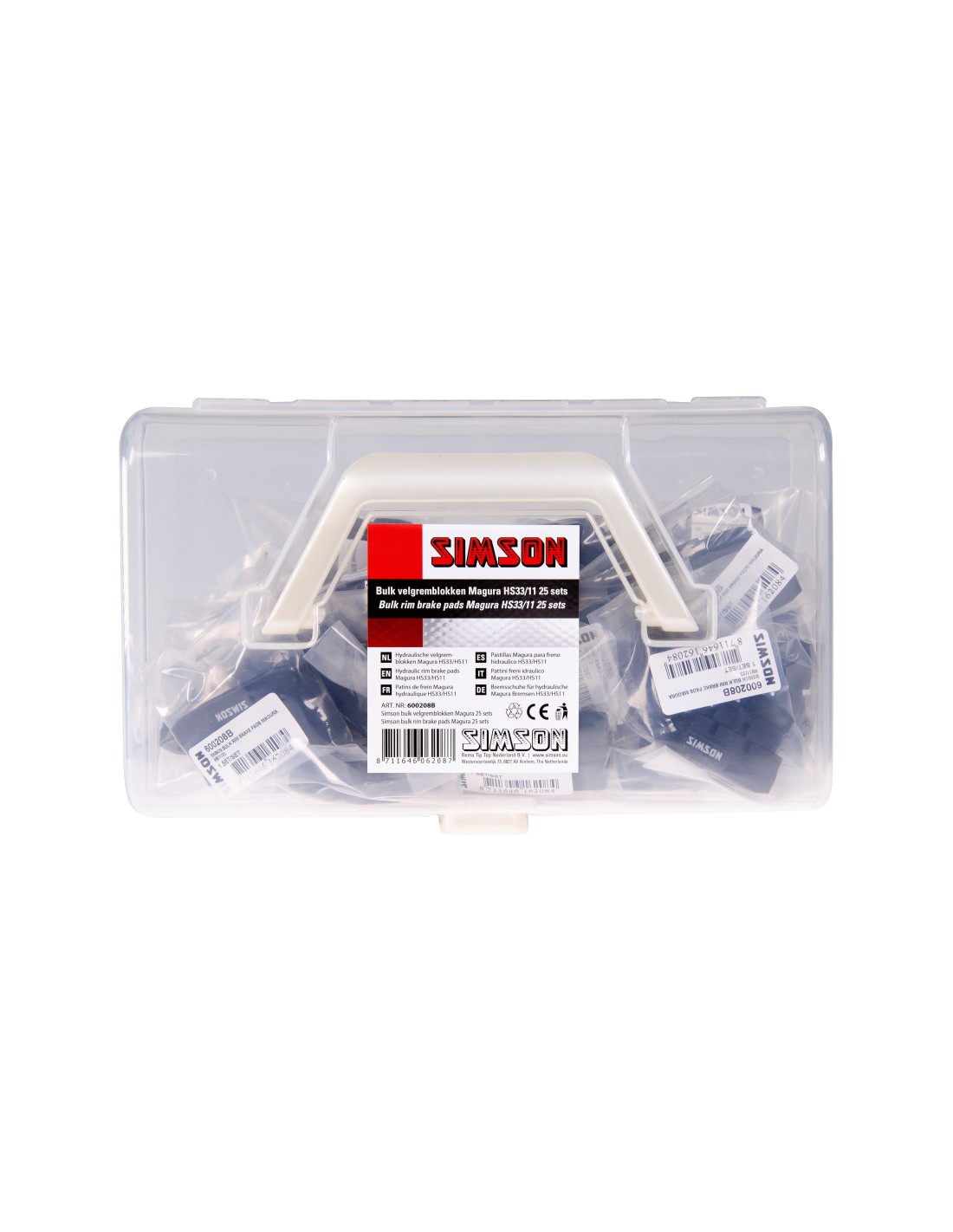 De Simson remblokken voor Magura hydraulische velgrem, in bulk verpakking, zijn geschikt voor het type Magura HS33/HS11 remsysteem. De remblokken zijn geschikt voor zowel voor- als achterrem. De remblokken worden per 25 sets in een handige koffer geleverd. Iedere set is apart verpakt en voorzien van een eigen unieke barcode waardoor iedere set te scannen is.