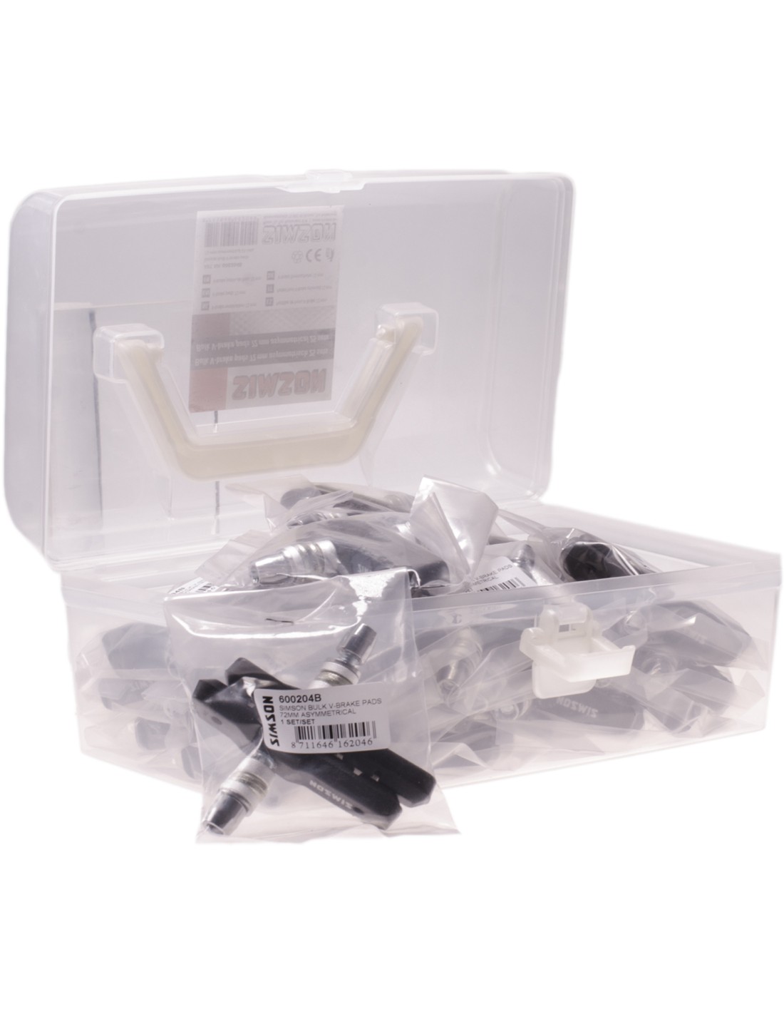 De Simson Bulk V-brake remblokken worden per 25 sets geleverd in een handige draagbare bewaar box en voorzien van een barcode. De remblokken zijn 72mm breed en asymmetrisch. Iedere set is apart verpakt en voorzien van een eigen unieke barcode waardoor iedere set te scannen is. De remblokken zijn voorzien van het Simson logo en een markering met rechts of links waardoor een juiste montage eenvoudig is. De zachte compound van het remblok zorgt voor veel remkracht.