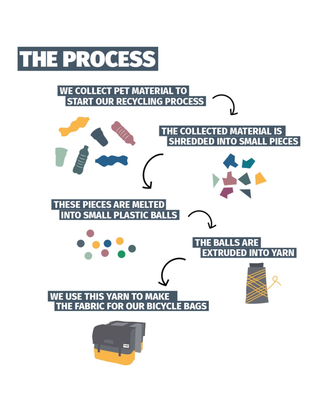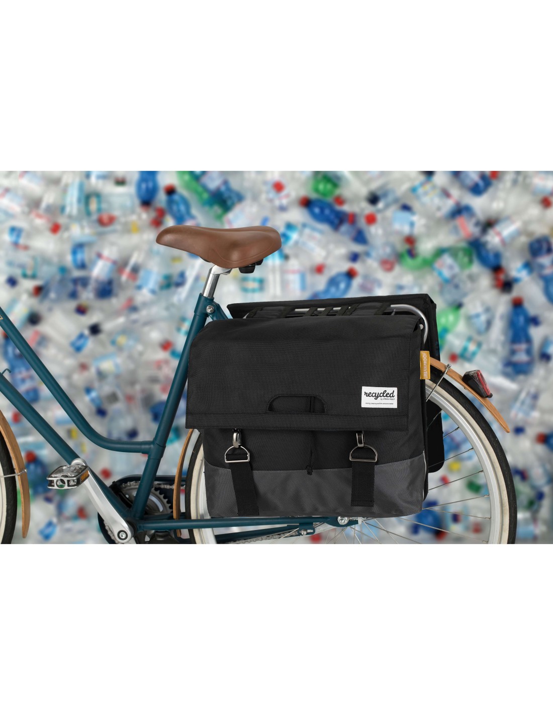 De Urban Proof dubbele fietstas 55L is een duurzame tas gemaakt van gerecycled PET materiaal (RPET). Dit zijn PET-flesjes en andere PET artikelen die anders in de verbrandingsoven of op een afvalberg terecht zouden zijn gekomen. In dit product krijgen deze materialen een nieuw leven. De hoeveelheid RPET dat in deze tas is gebruikt staat gelijk aan 85 PET flesjes van 500ml. [ENTER_ENTER] Onze 55L dubbele fietstas is een sterke tas met een verstevigde rug en bodem, gemaakt van gerecycled PET materiaal (RPET). De tas heeft twee ruime opbergvakken met een totale inhoud van 55 liter. Hij is zo gemaakt dat je snel en eenvoudig de tas kan openen en sluiten met de chromen haken. De tas is gemaakt van waterafstotend RPET en heeft aan de binnenkant een waterbestendige voering als extra bescherming voor jouw spullen. Met de daarvoor bestemde riempjes is de dubbele fietstas eenvoudig aan jouw bagagedrager te bevestigen. Onze dubbele fietstas is een sterke tas met een verstevigde rug en bodem, gemaakt van gerecycled PET materiaal (RPET). De tas heeft twee ruime opbergvakken met een totale inhoud van 40 liter. Hij is zo gemaakt dat je snel en eenvoudig de tas kan openen en sluiten met de chromen haken. De tas is gemaakt van waterafstotend RPET en heeft aan de binnenkant een waterbestendige voering als extra bescherming voor jouw spullen. Met de daarvoor bestemde riempjes is de dubbele fietstas eenvoudig aan jouw bagagedrager te bevestigen. Voor elk verkocht item doneert URBAN PROOF 5% van de winst aan de stichting Love Not Waste. www.lovenotwaste.com