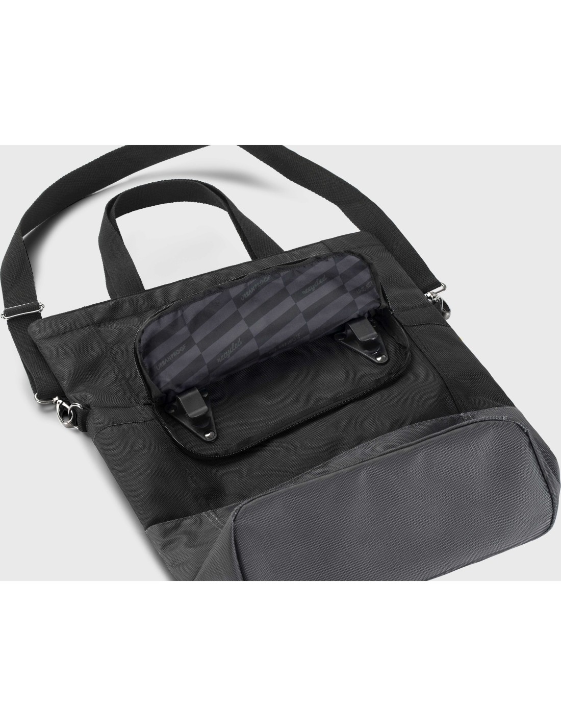 Urban Proof shopper tas 20L recycled zwart/grijs Deze shopper fietstas is zo ontworpen dat hij zeer gebruiksvriendelijk is maar er daarnaast ook nog erg mooiuitziet voor dagelijks gebruik. Het is een duurzame tas gemaakt van gerecycled PET materiaal (RPET). De ruime fietstas heeft een inhoud van 20 liter en kan eenvoudig afgesloten worden met de magnetische sluiting. Met de bevestigingshaken die aande achterkant van de tas zitten, is de shopper tas gemakkelijk achterop de fiets te bevestigen. Deze haken zijn weggewerkt meteen ritssluiting. De URBAN PROOF fietstas heeft eenhandvat, een korte band en een schouderband zodat je de tas op elke wenselijke manier kan dragen. Aan de voorkant en aan de binnenkant zit een los vak om eenvoudig je sleutels, portemonnee en telefoon op te bergen. Voor elk verkocht item doneert URBAN PROOF 5% van de winst aan de stichting Love Not Waste. www.lovenotwaste.com