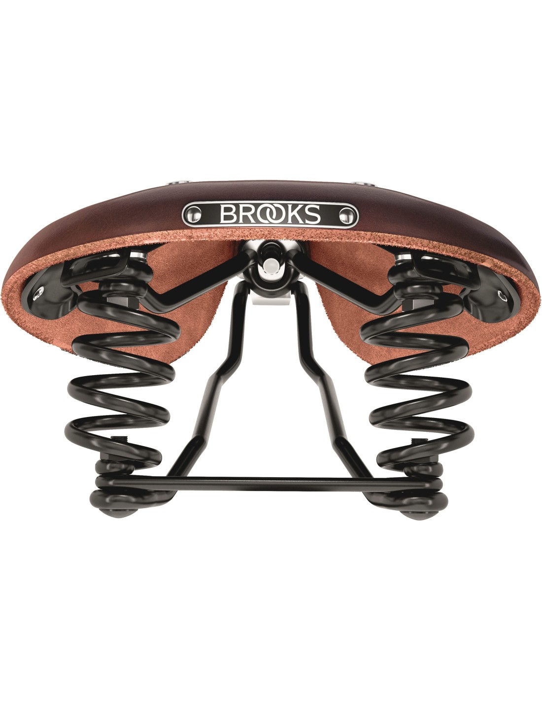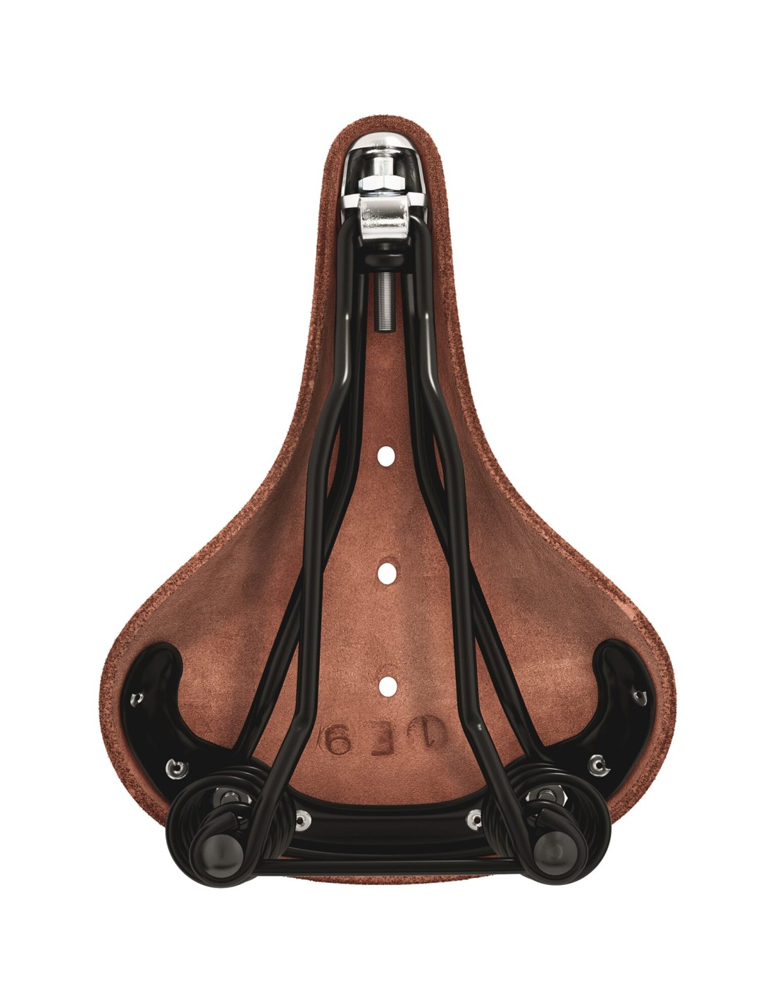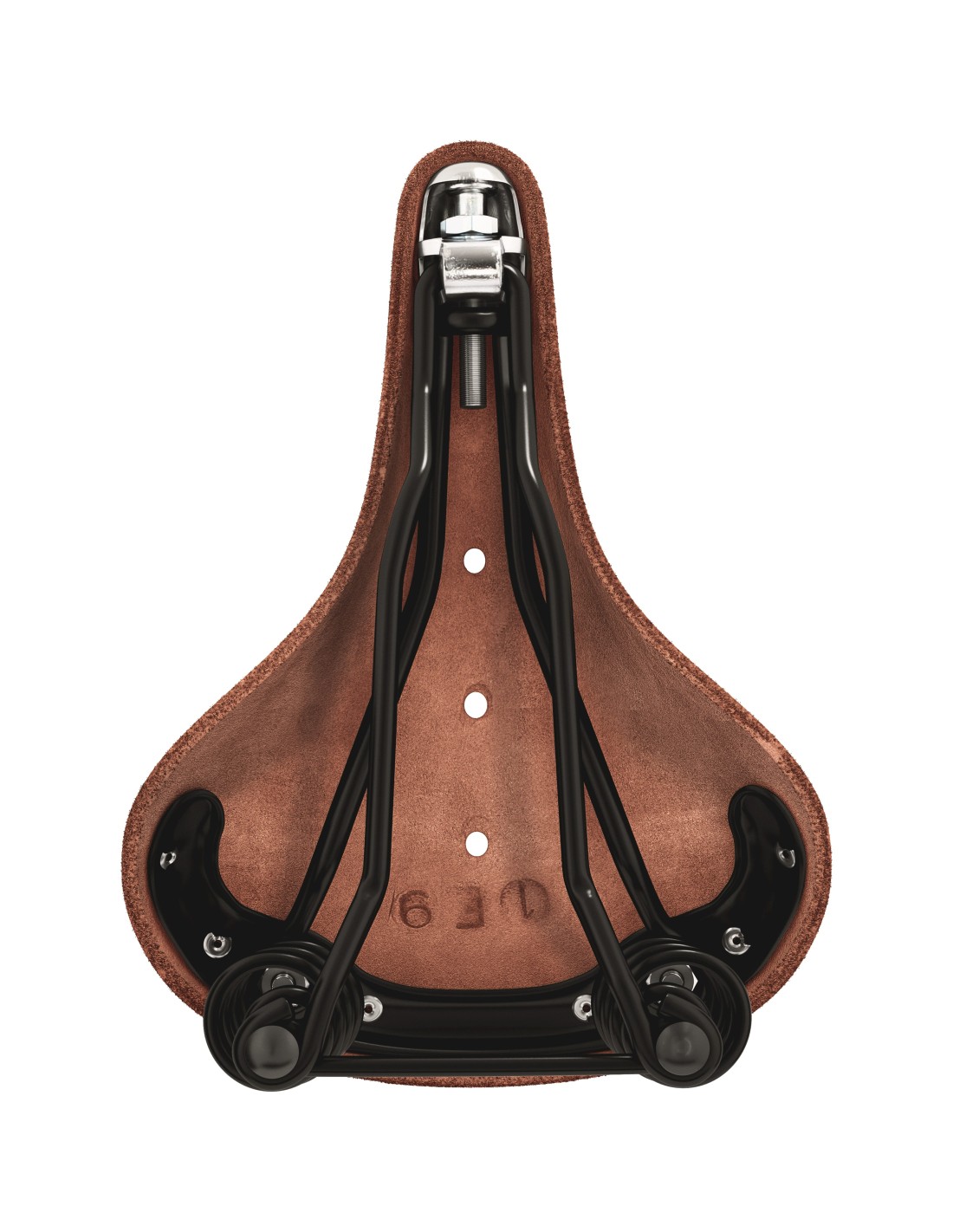 De Flyer is een toerzadel met vering, gebaseerd op ons klassieke Brooks B17-model. Dit zadel is perfect voor avontuurlijk fietsen, woon-werkverkeer en langeafstandstochten. De Flyer heeft dezelfde leren bovenkant als het B17-model en combineert het comfort van leer met extra vering. De Flyer is een van onze populairste modellen en wordt met de hand gemaakt in onze fabriek in Smethwick, Engeland. Hij wordt standaard geleverd met stalen buisvormige klinknagels en een zwart gepoedercoat onderstel.